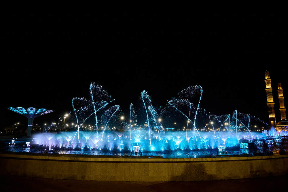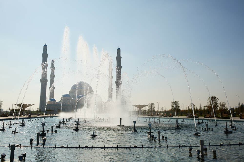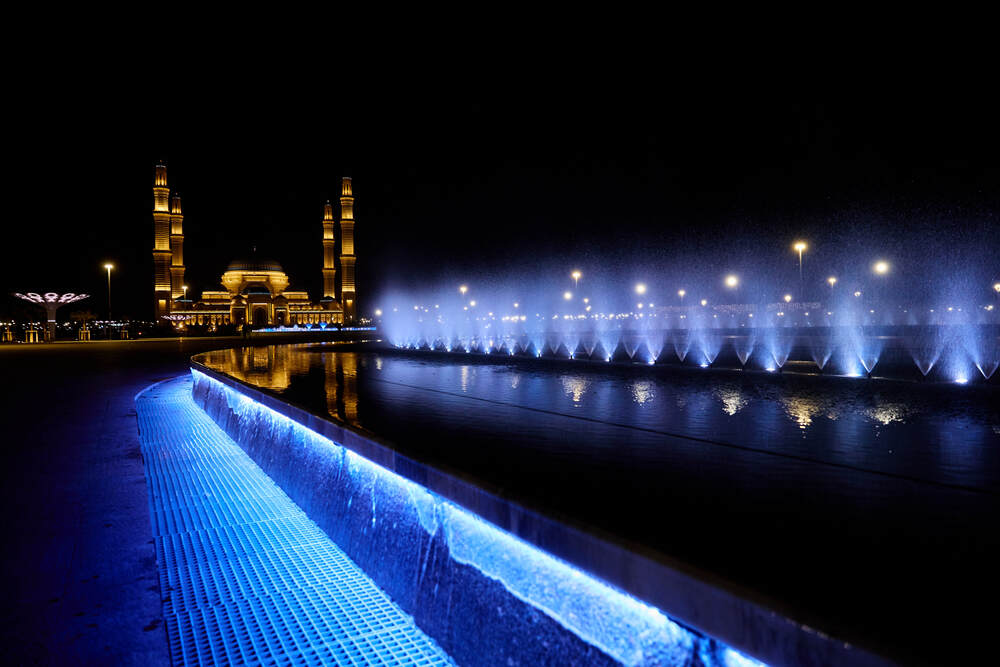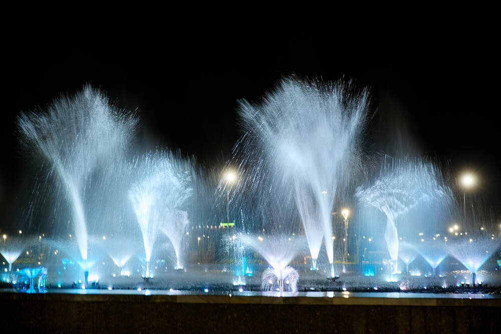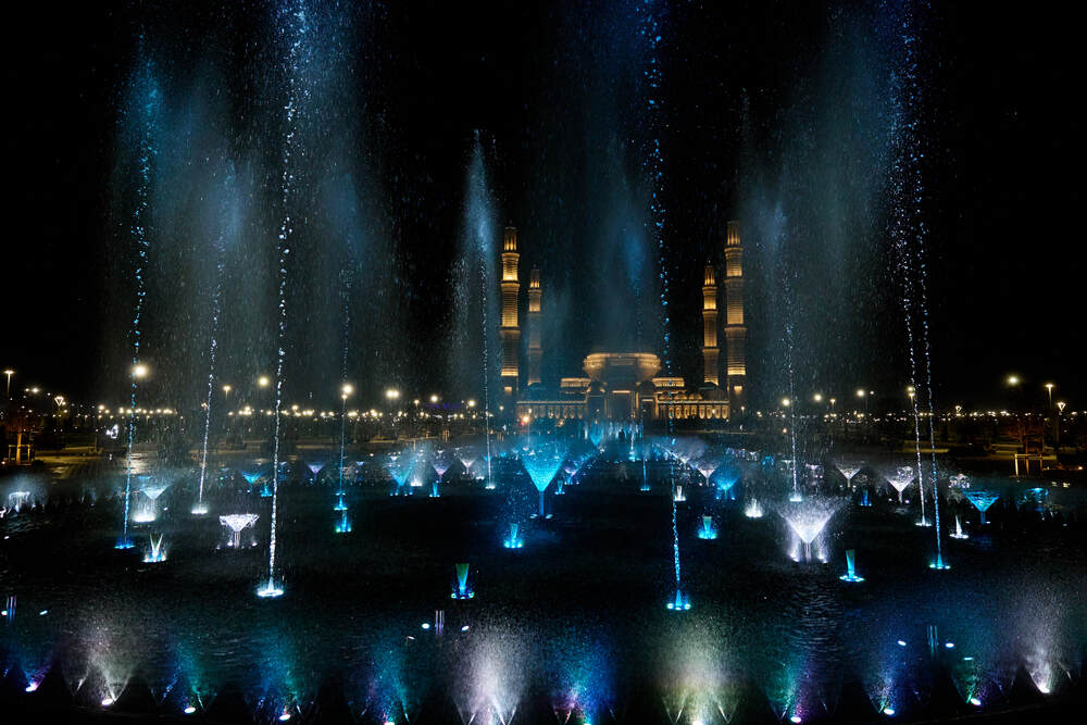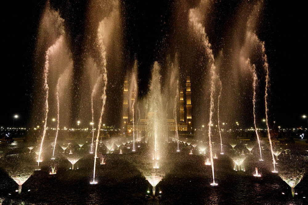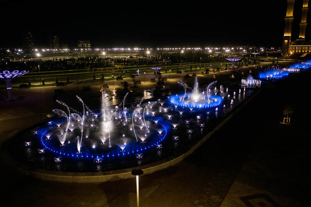 Комплекс динамических фонтанов с подсветкой и музыкой, Соборная Мечеть, город Астана