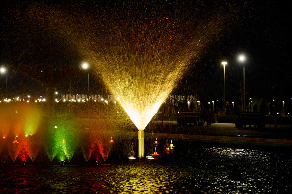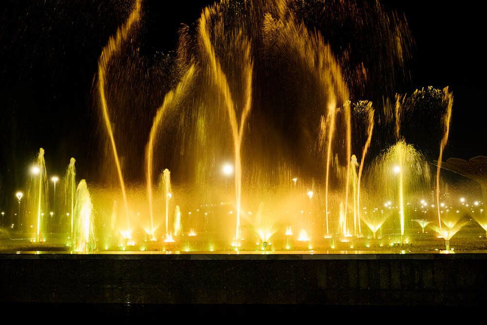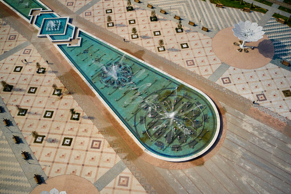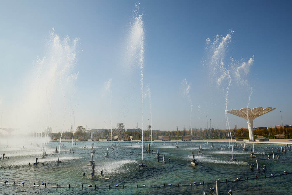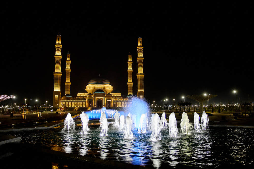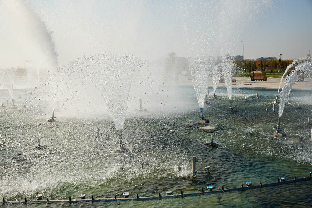 Комплекс динамических фонтанов с подсветкой и музыкой, Соборная Мечеть, город Астана
