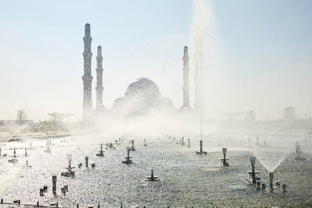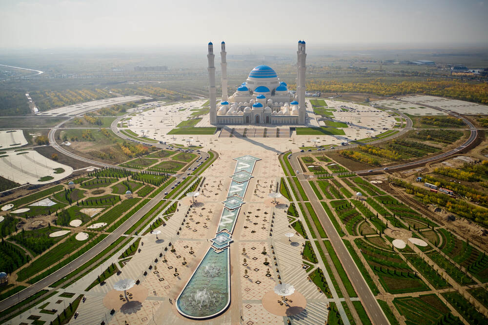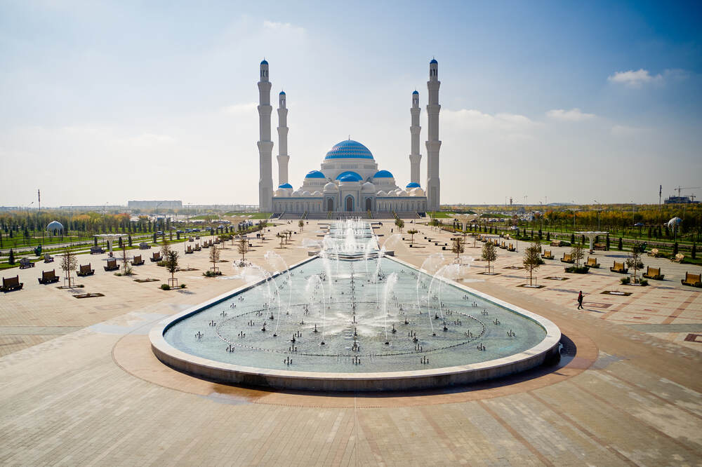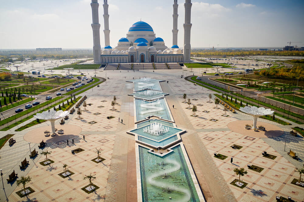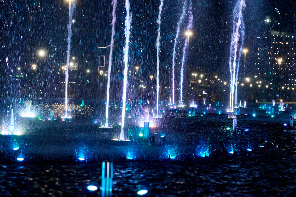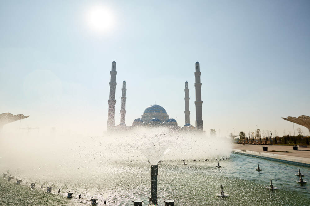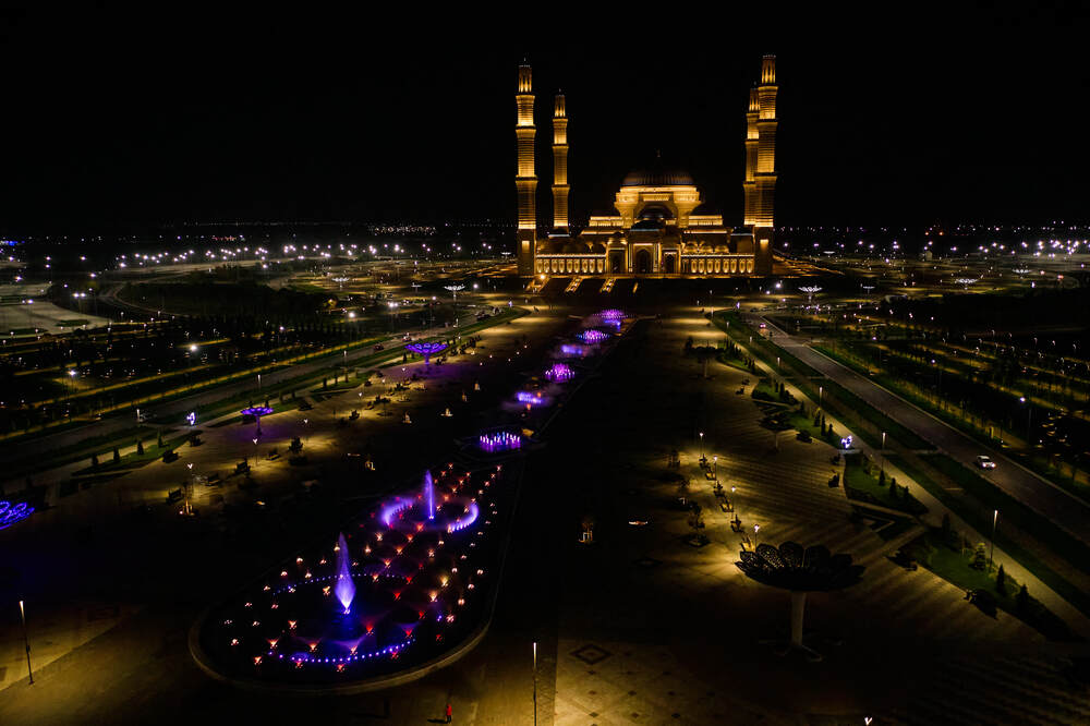 Комплекс динамических фонтанов с подсветкой и музыкой, Соборная Мечеть, город Астана