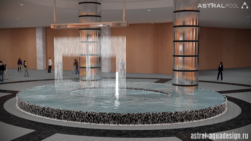 Представляем вашему вниманию проект фонтана состоящего из двух частей: верхней и нижней. Водный рисунок в нижней части создают пенные и туманные насадки. Цифровой водопад установленный в верхней части может создавать разнообразные узоры или образовывать единое водное «полотно» подходящее для трансляции видео или лазерной проекции.