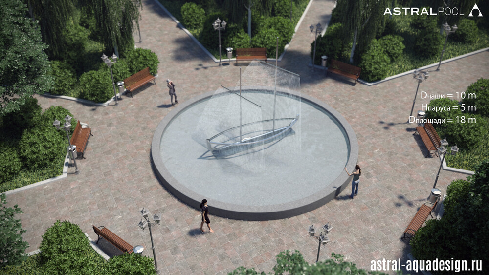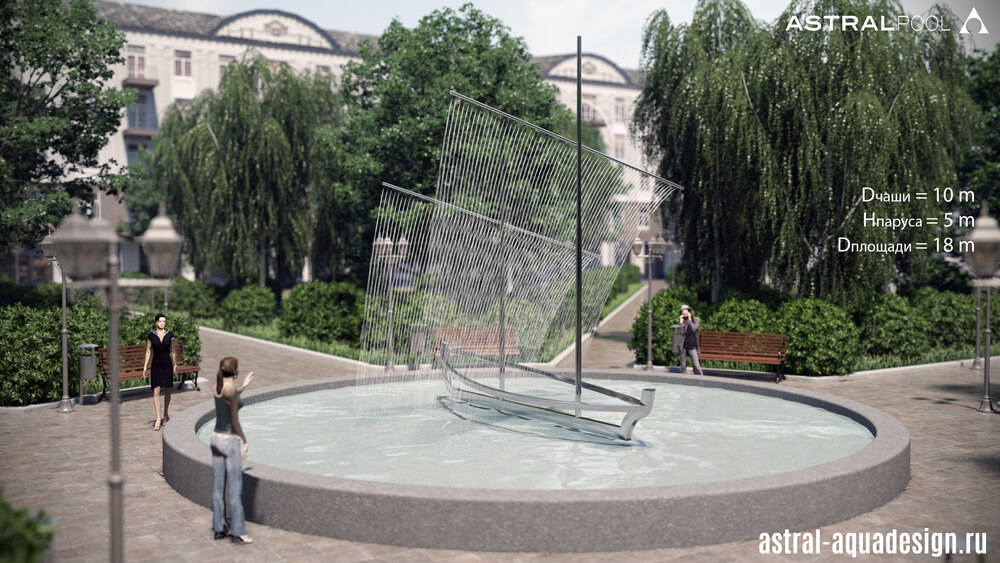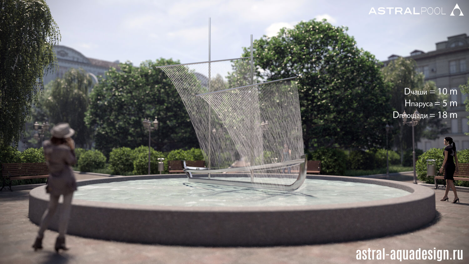 Наши специалисты разработали проект очень необычного и зрелищного фонтана в чаше. Он представляет собой скульптурную композицию изображающую старинный двуxмачтовый бот, расположенный в круглой чаше. В этом фонтане два ряда струй направлены сверху вниз образуя наполненные ветром паруса.
