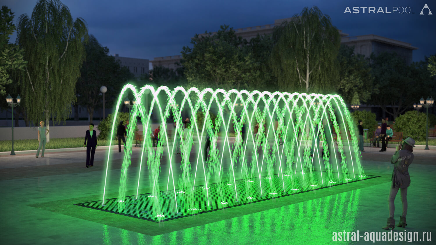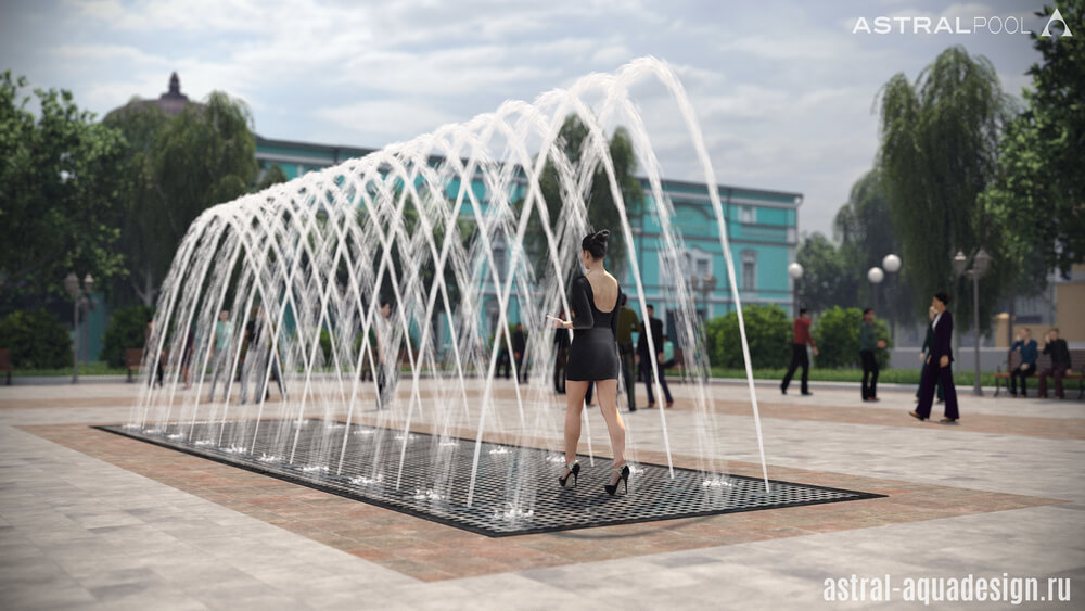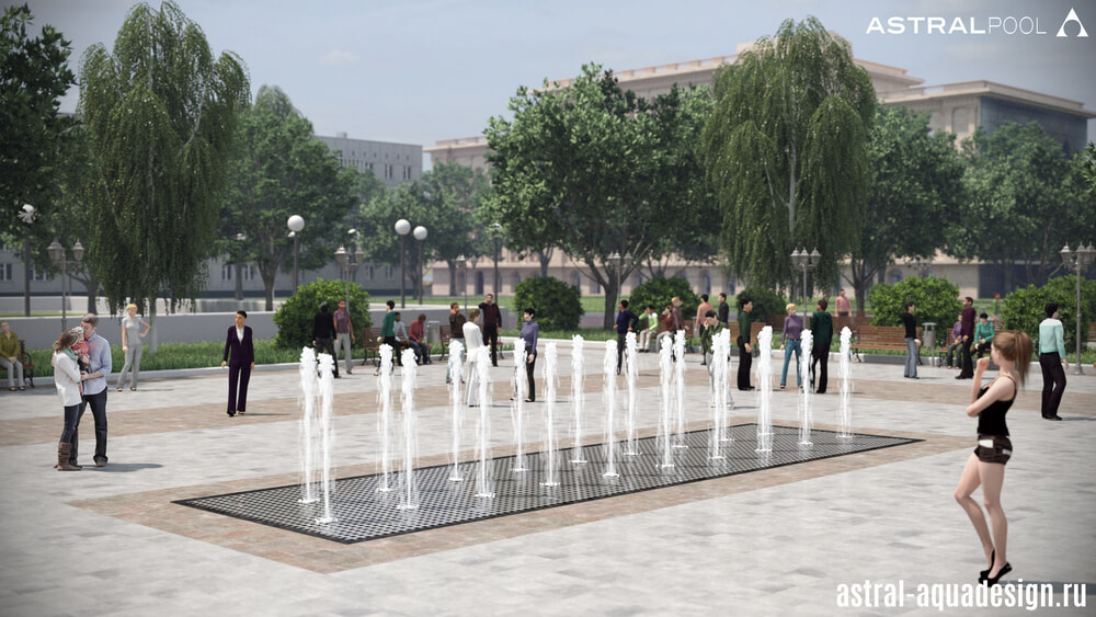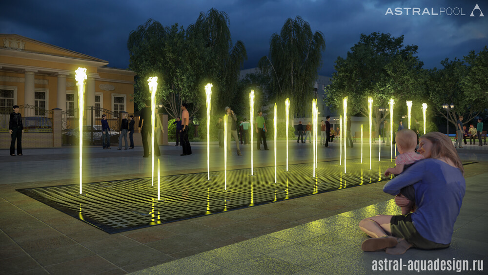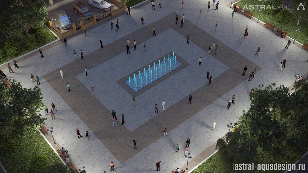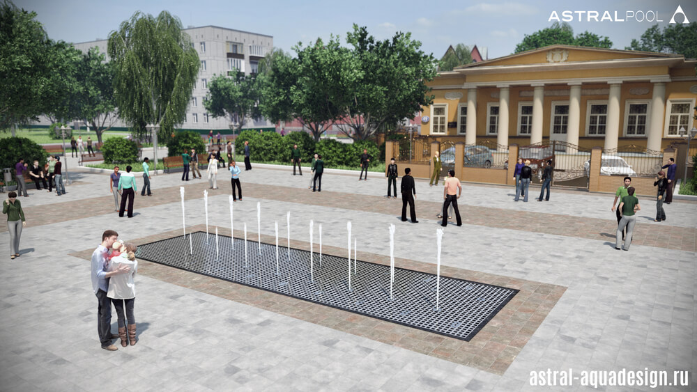 Согласно проекту благоустройства этот небольшой цветодинамический фонтан может быть построен рядом с музеем-усадьбой в Брянске. В архитектурном стиле, окружающее пространство может быть отнесено к началу 20 века, однако новый водный объект прекрасно подойдёт в качестве украшения сквера. Лаконичный водный рисунок образуют пенные столбы, чередующиеся с параболическими струями образующими коридор.