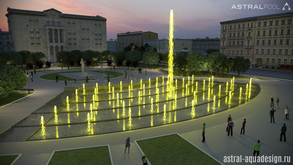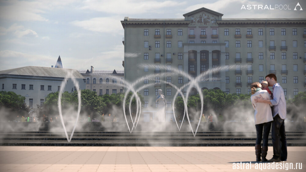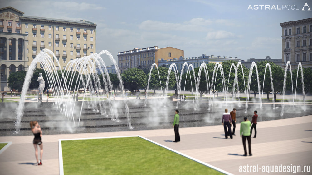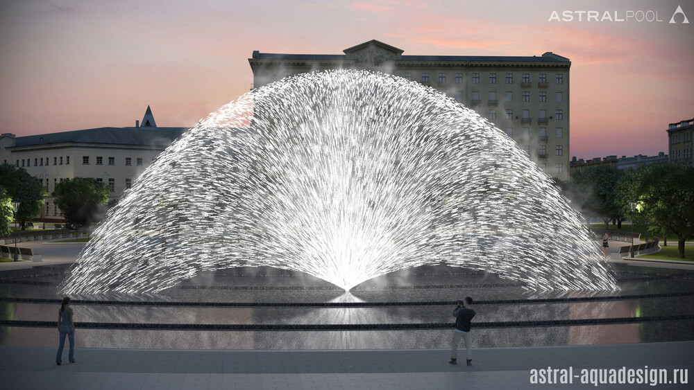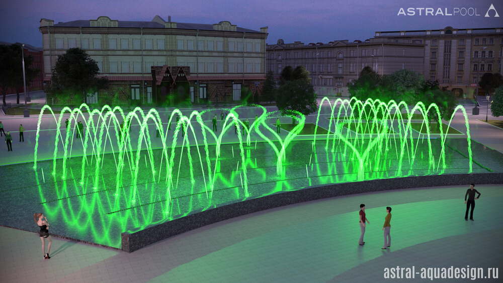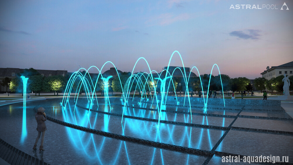 Этот проект был создан нашими специалистами для строительства на одной из площадей Оренбурга. Предполагается, что чаша будет выполнена в виде веера. Ее покрытие предполагай создание эффекта зеркала, для отражения окружающего ландшафта и зданий. В проекте будут участвовать несколько видов насадок: туманные, качающиеся, пенные столбы и дуги.